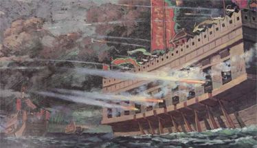 the country's naval forces, and he had energetically set about building warships and training their crews. In particular, on the model of vessels already in use in the mid-fifteenth century, he built his famed "turtle ships" (kobukson) with a protective covering (thought to have been iron plated) to ward off enemy arrows and shells, and in addition with numerous spikes implanted to prevent the enemy from boarding. He also placed cannon around the entire circumference of the ships, so that attack could be made at will from any side. His preparations made, Yi Sun-sin set forth